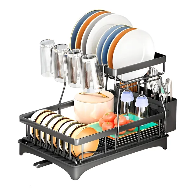 Este escorredor de louça é a escolha ideal para quem busca praticidade, organização e melhor aproveitamento do espaço na bancada ou pia. Com capacidade para até 12 pratos, ele conta com dois níveis bem distribuídos, permitindo acomodar pratos, copos e outros utensílios de forma segura e funcional no dia a dia. A estrutura metálica possui acabamento resistente à corrosão, garantindo maior durabilidade e um visual moderno. Acompanha porta-talheres e escorredor para copos, facilitando a organização completa da louça. A bandeja coletora de água ajuda a manter a bancada sempre seca e limpa, enquanto a base antiderrapante oferece mais estabilidade durante o uso.